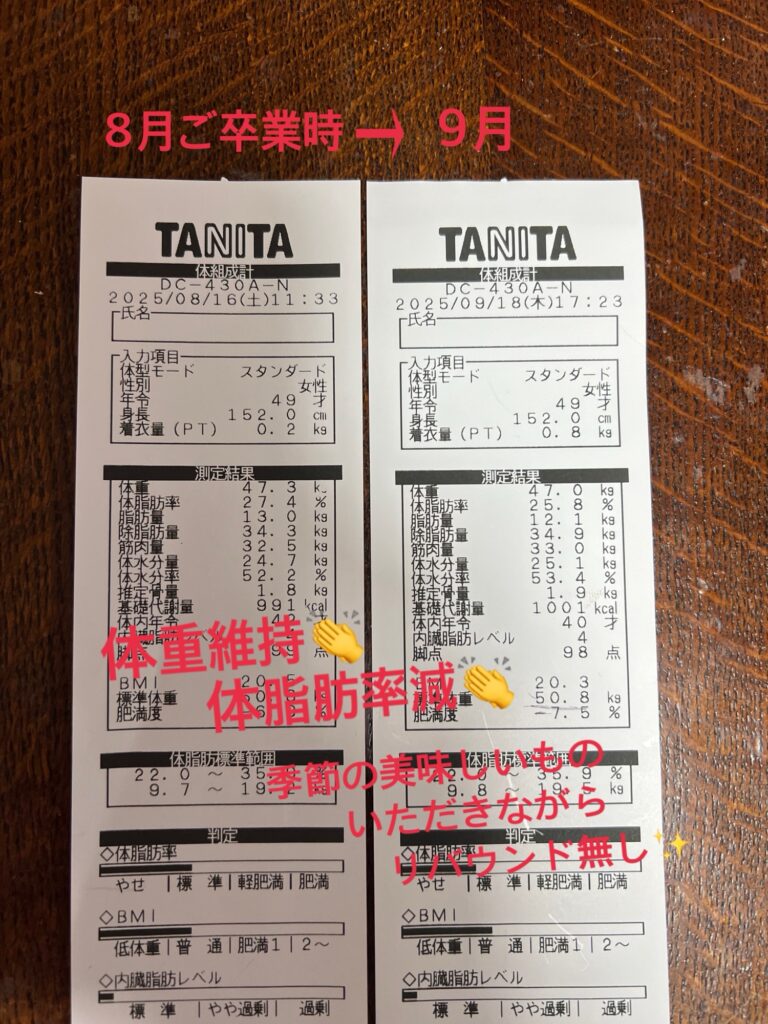 8月にダイエット卒業され、9月ご来店時の、体組成計の数値、ご覧ください。